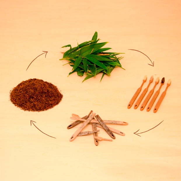 歯ブラシの柄の部分は、ポリ乳酸樹脂と竹の微粉末をブレンドした素材でできており、使用後に焼却する際の燃焼カロリーが低く、CO2の排出量は一般の樹脂に比べて少なくなります。また、1年で育つ植物素材を使用しているため、サスティナブルな歯ブラシです。竹は三重県伊賀市で育ったものを自社で管理しており、全て国内工場で丁寧につくられています。